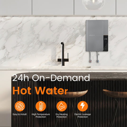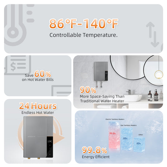 Experience instant hot water at 114°F within seconds. No preheating, no temperature fluctuations – just consistent comfort for showers, sinks, and more.