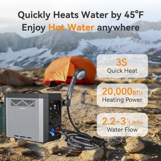 With 20,000 BTUs, this heater raises water temperature by 45°F (25°C) in no time! Perfect for those chilly mornings or after a day of hiking.